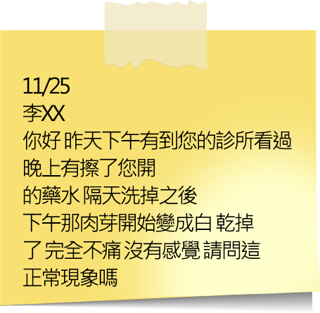 1~5日:精製中藥水擦在患部一次即可,不刺激不腐蝕,已滲入疣體截斷養份 開始乾扁萎縮 自然脫落。