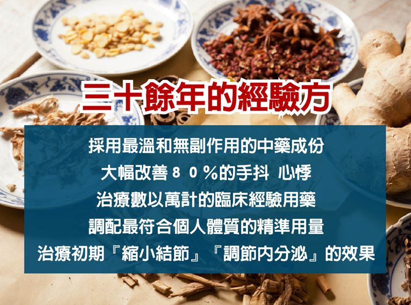 在我三十年來針對甲狀腺亢進和結節不斷研究和治療,配合豐富的臨床經驗能分辨患者不同的體質、脈象、虛實、寒熱,開出最適合每一位患者的量身藥方,先以對症療法來治療手抖、眼突、心悸獲得初期的改善,再以方劑抑制結節持續變大,軟堅散結縮小,一段時間過後,再採用滋陰補氣、健脾益氣等以培元固本,徹底治療來防止甲狀腺腫大,抑制復發的機會,輕症者十五~二十天就能有明顯的改善,甚至就好了,重症者也可以在二~三個月徹底治癒。就如同上述那位小姐,兼顧健康和家庭,所以甲狀腺機能亢進確實是可以以中醫中藥來徹底治癒的,從此擺脫因甲狀腺疾病帶來不便和困惱,這都是初診患者所意想不到的成效。