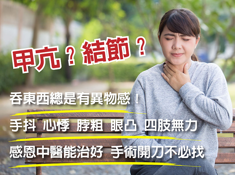 「甲狀腺疾病的患者越來越多」在我最近十多年臨床治療上,因甲狀腺腫大而求診的患者逐年增加,曾經有一個家族約半數以上女性,都來找我治療甲狀腺方面的疾病。首先,你知道自己的甲狀腺腫大,一定就是甲狀腺機能亢進嗎?感恩中醫臨床上將甲狀腺疾病分類為: